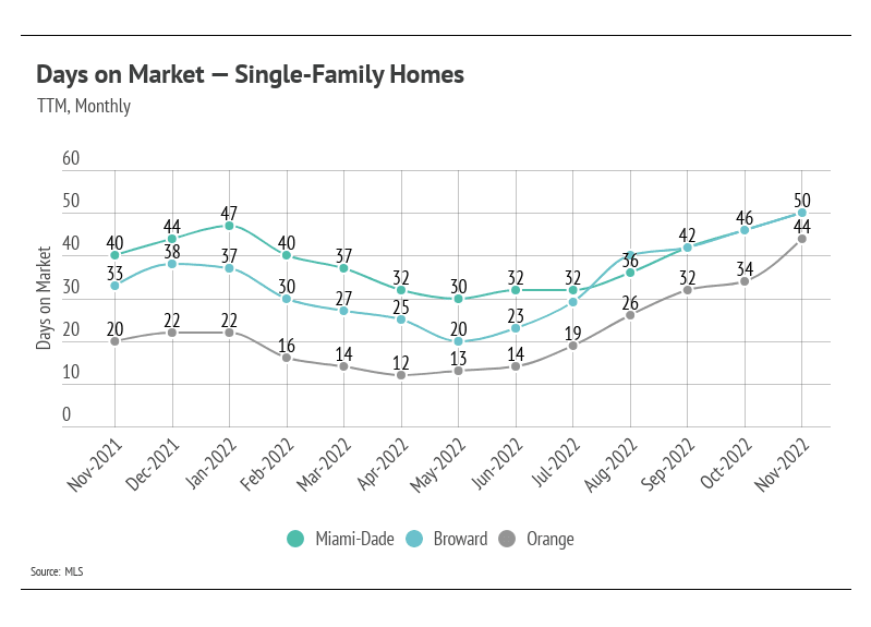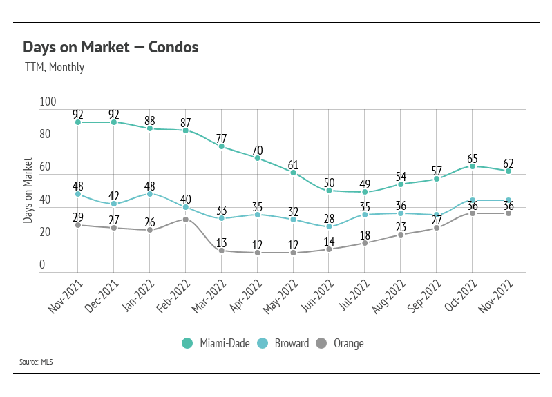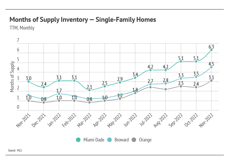 Months of Supply Inventory has trended higher since the summer and now indicates a sellers’ market in Orange County, a balanced market in Broward County, and a buyers’ market in Miami-Dade County.