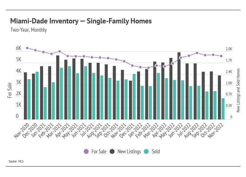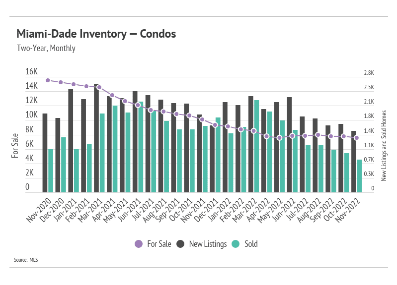 Florida, along with the rest of the country, has not returned to anywhere near pre-pandemic inventory levels after the buying boom last year. We were happy to see more single-family homes come to market, but there weren’t enough new listings to meaningfully increase inventory this year. Condo inventory especially failed to grow, and the number of condos for sale in Miami-Dade landed just above the all-time low in November. Rates have definitely impacted demand more recently. Softening demand has brought the market toward balance despite declining inventory.