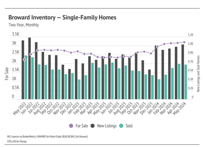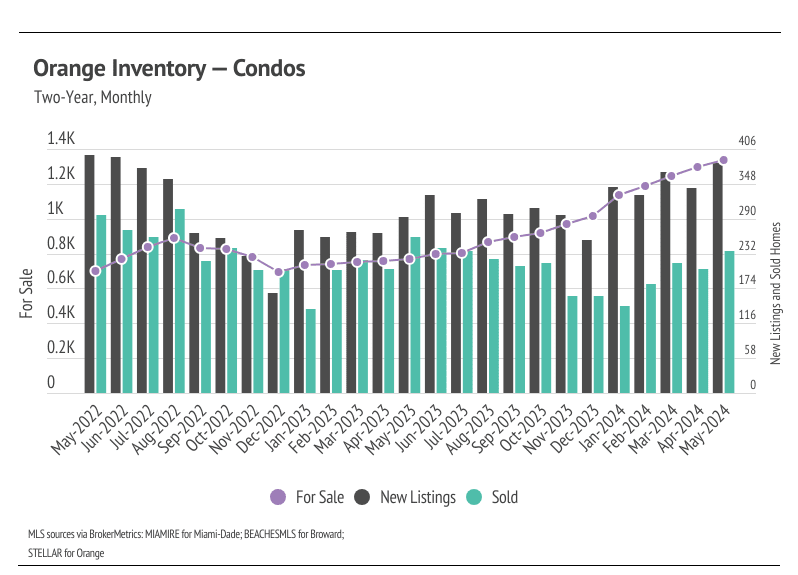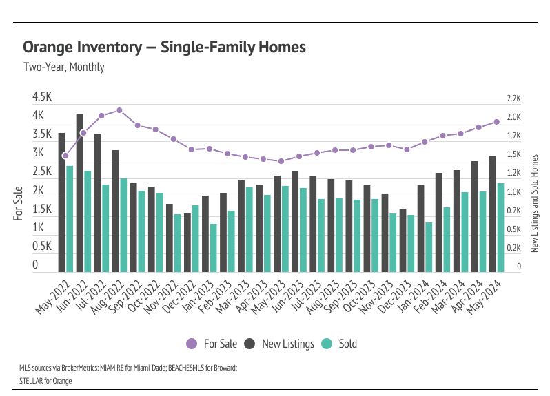 In terms of supply and demand metrics, in 2024, the selected markets aren’t trending similarly. Miami-Dade supply is showing signs that inventory will be tight for the rest of the year, and sales are slowing. Broward inventory is strong, but sales are also starting to slow. In Orange, both inventory and sales are still growing.
