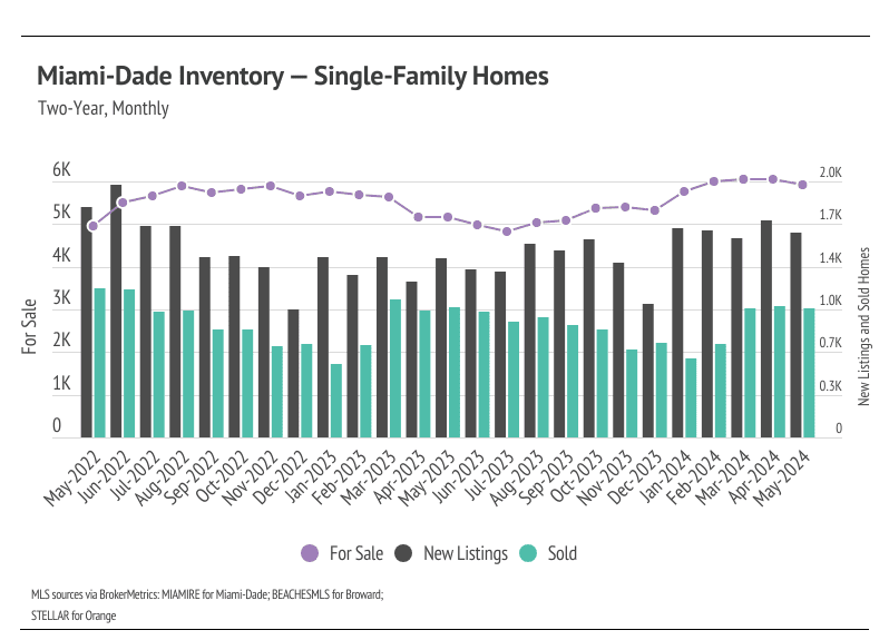 Months of Supply Inventory (MSI) quantifies the supply/demand relationship by measuring how many months it would take for all current homes listed on the market to sell at the current rate of sales. The long-term average MSI is around four to five months in Florida, which indicates a balanced market. An MSI lower than four indicates that there are more buyers than sellers on the market (meaning it’s a sellers’ market), while an MSI higher than five indicates there are more sellers than buyers (meaning it’s a buyers’ market). MSI rose significantly in the second half of 2023, largely due to the decline in sales and longer time on the market, and continued to rise in January 2024. However, January is unusual in that new listings jumped higher across the selected areas, which caused inventory to rise rapidly month over month and increased the proportion of active listings to sales. As expected, in February and March, MSI corrected and declined meaningfully across markets. In May, for single-family homes, MSI indicates sellers’ markets, and for condos, MSI indicates a balanced market in Orange and a buyers’ market in Miami-Dade and Broward.