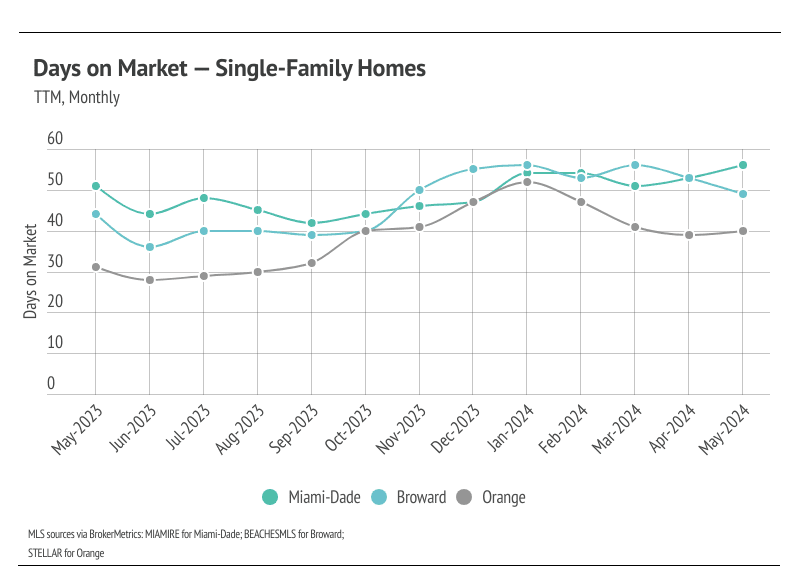Months of Supply Inventory dropped across markets since January. Currently, for single-family homes, MSI indicates the selected markets favor sellers. For condos, MSI indicates a balanced market in Orange and a buyers’ market in Miami-Dade and Broward.