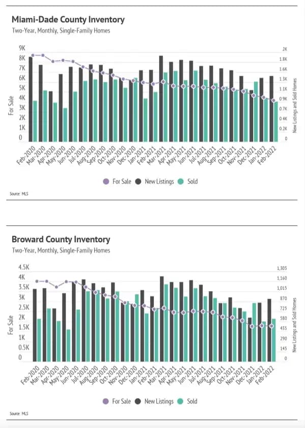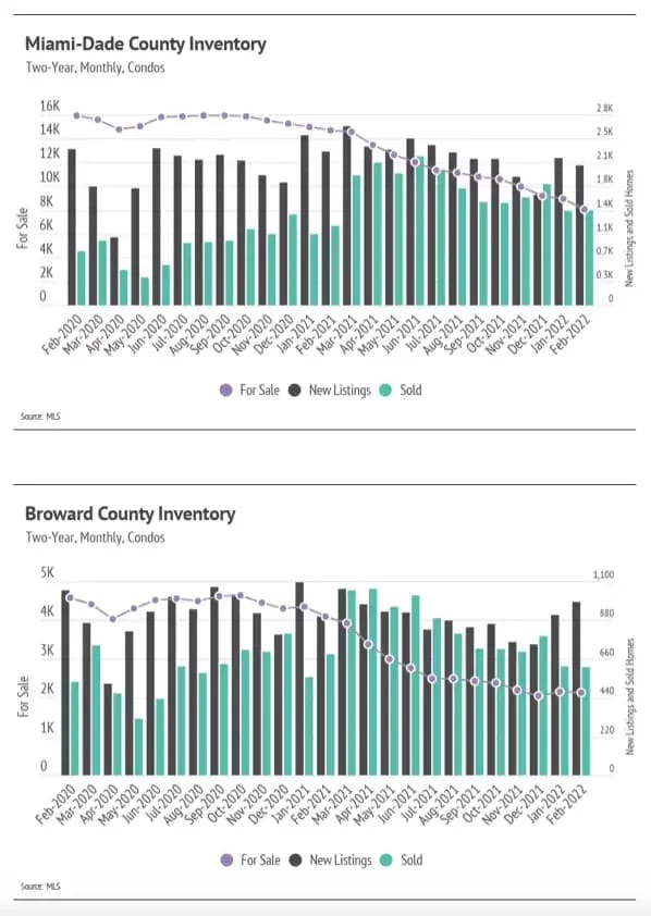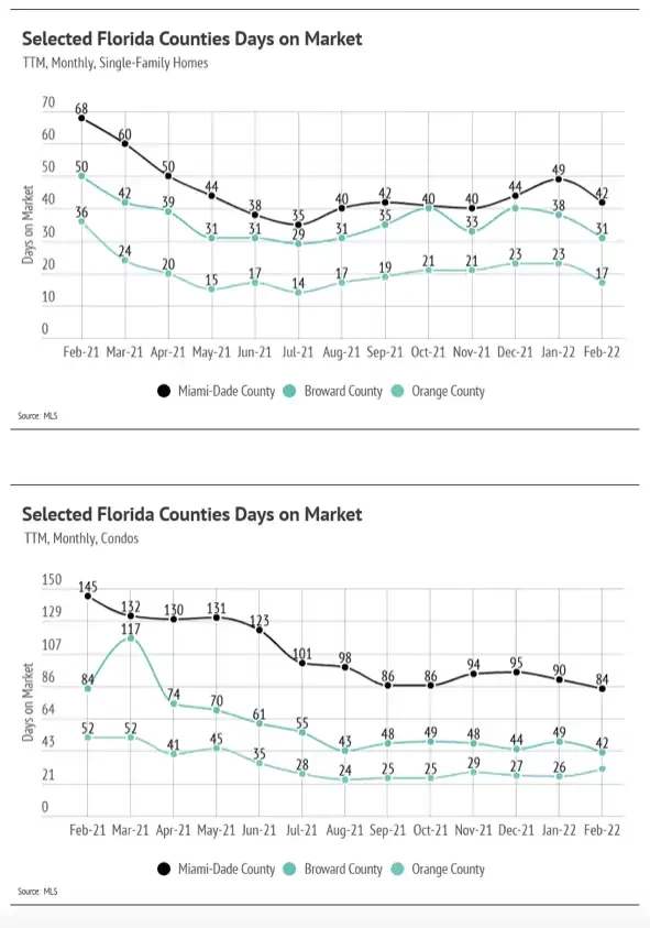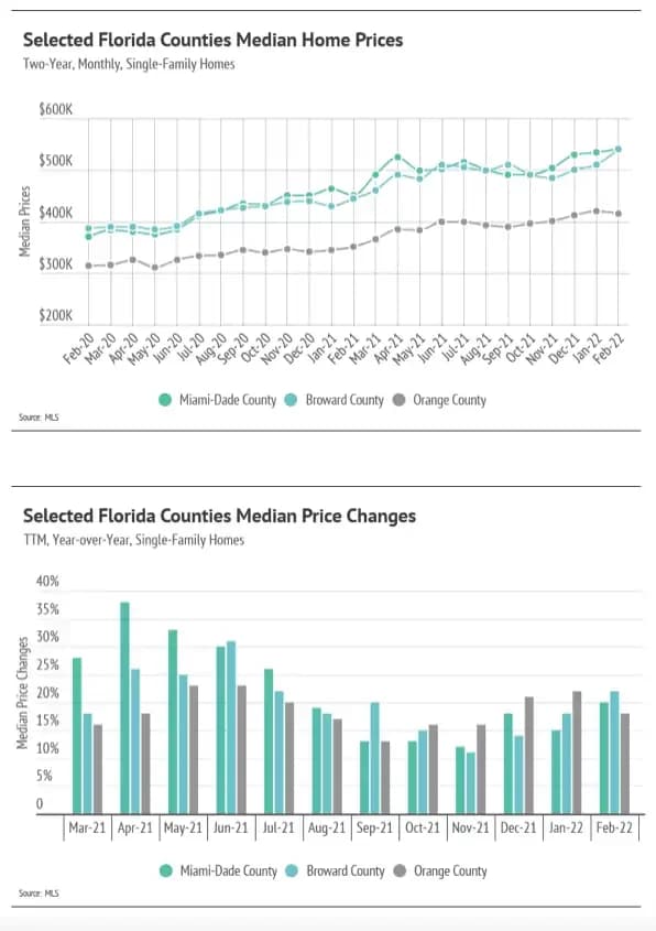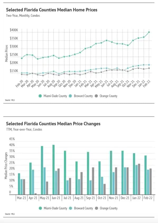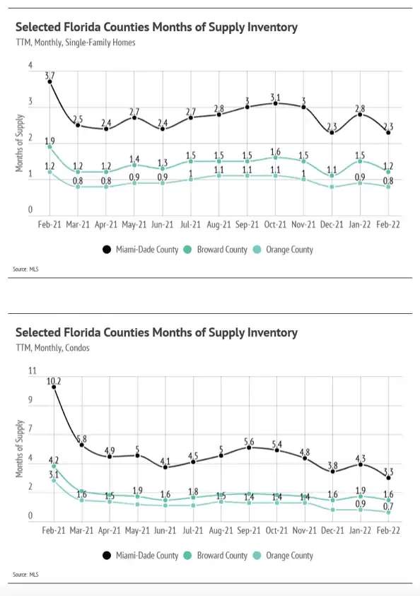 Single-family home and condo prices rose to all-time highs across Florida counties in February 2022 with the exception of Orange County single-family homes, which declined from the January peak. Mortgage rate hikes really only lower demand in the long-term; in the short-term, demand increases as buyers try to lock in a lower rate. The housing market in Florida has a major advantage in that people simply want to live there. Despite the huge increases in home prices over the past 18 months, Florida’s lack of housing supply will keep prices rising in the year to come.