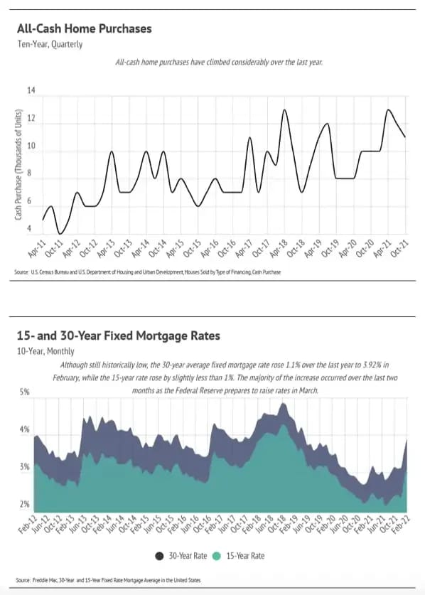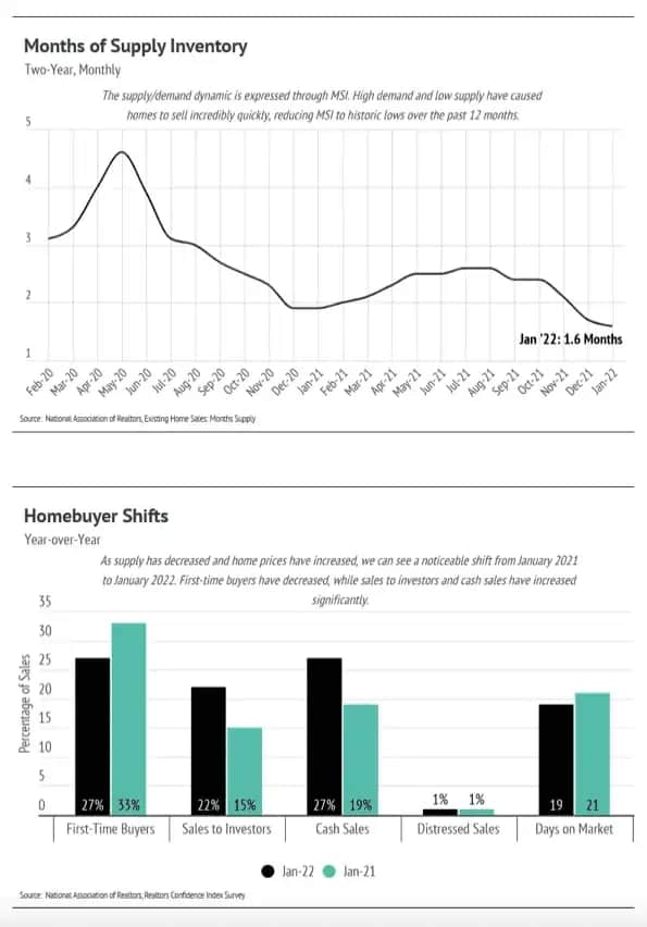 The Fed is expected to raise interest rates by 0.25% six times this year, going from 0% to 1.50%. We are now entering a period where factors that affect prices are more mixed, unlike the past two years when all the factors caused prices to increase. Rising interest rates, which will hopefully curb the still-rising inflation, will make homes less affordable and dampen demand over the course of the year. But inventory is so low that even with less demand, the market will likely be undersupplied. It might seem counterintuitive that home prices can still appreciate after increasing so much over the past two years, but with inventory at record lows, home prices in 2022 will still increase — though at a slower rate than in 2021. With high sales relative to the available inventory, we anticipate a competitive market in the year ahead.