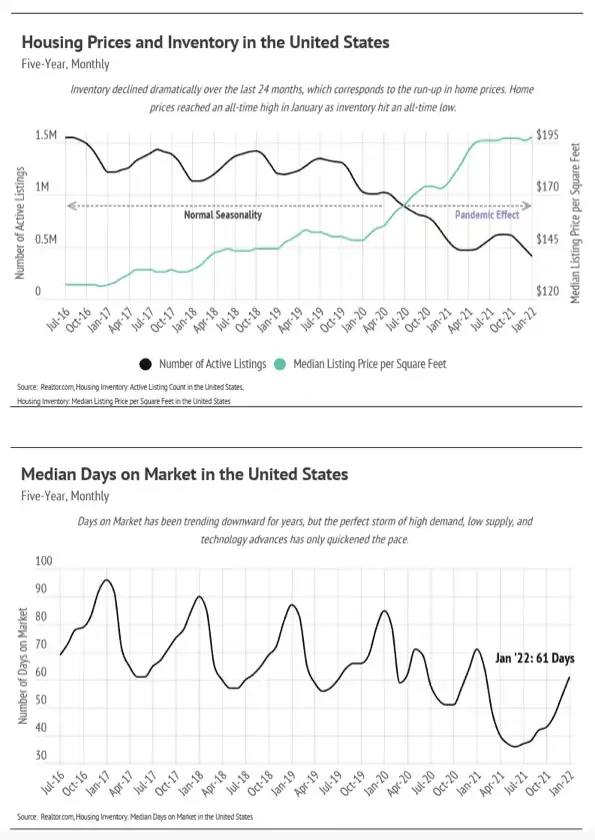 Seasonality in the housing market was incredibly steady before the pandemic. Prices typically rose from January to June, when inventory was low but rising, and then flattened from July to December, when inventory was high but declining. In January 2020, homes were already undersupplied, hitting a record low with just over a million homes for sale on the market. When the pandemic hit, demand for homes exploded, dropping inventory to shockingly low levels. During the 18 months between January 2020 and June 2021, inventory declined 49% and prices increased 32%, doubling the total price increase of the previous three years combined. By January 2022, inventory had reached an all-time low, down 60% in the past two years, while home prices reached a record high, up 34%.