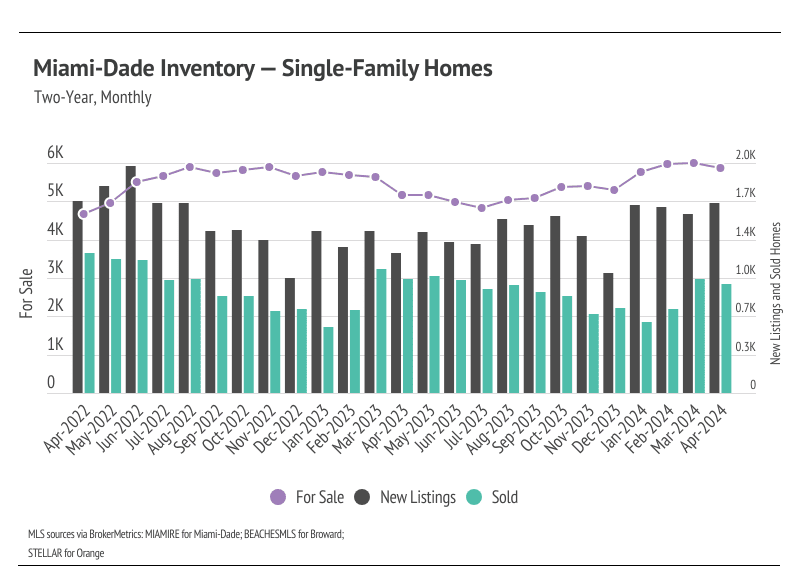Inventory declined for single-family homes in Miami-Dade and Broward in April, which may indicate tight supply for the rest of the year in those markets