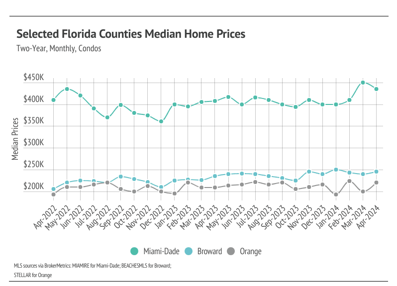 Months of Supply Inventory fell across markets over the past three months. Currently, for single-family homes, MSI indicates the selected markets favor sellers. For condos, MSI indicates a balanced market in Orange and a buyers’ market in Miami-Dade and Broward.