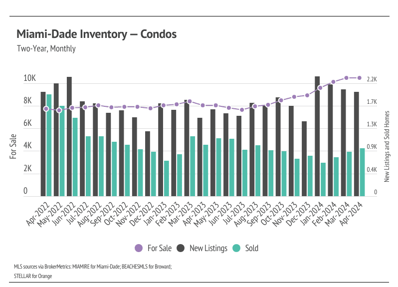 In Florida, home prices haven’t been largely affected by rising mortgage rates — even recently reaching all-time highs during a period of rapidly rising mortgage rates. In February, the median single-family home prices in Miami-Dade and Broward, and the median condo price in Orange, all hit all-time highs. In March, Miami-Dade single-family home and condo prices continued that trend, reaching new all-time highs again. Although Miami-Dade condo prices fell from the all-time high last month, single-family home prices in Miami-Dade and Broward reached record highs in April. Prices almost never peak this early in the year, indicating that home prices will likely rise to a new high in almost every month during the first half of the year. Florida has been in an interesting spot recently, where residents are starting to move because home insurance prices have risen, which has brought more listings to the market. However, demand is still strong, so the low but rising inventory and new listings will only raise prices as demand grows. More homes must come to the market in the spring and summer to get anything close to a healthy market, and we are already seeing more new listings coming online.