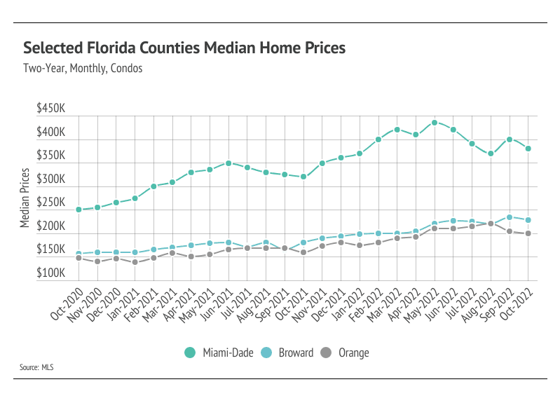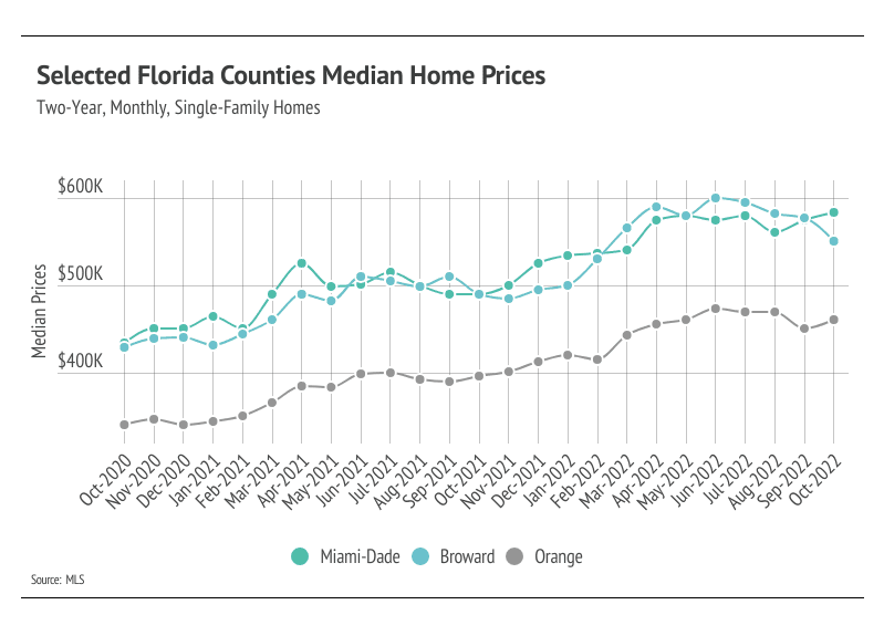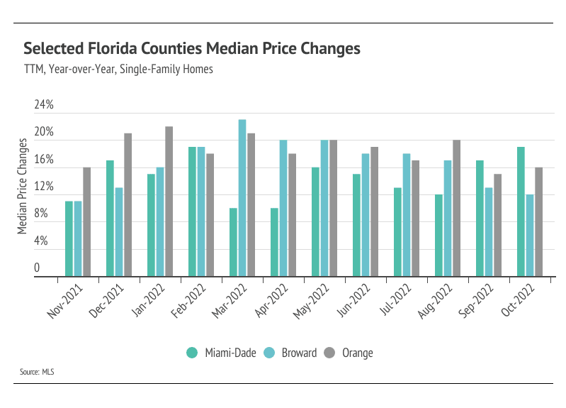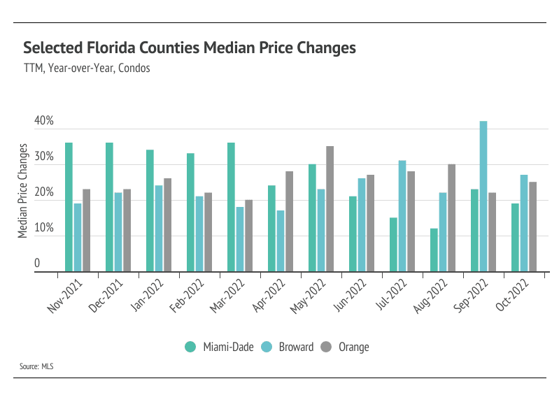 We have enough data to show that the housing markets in Florida are cooling substantially after one of the hottest real estate markets in history. However, demand in the selected counties is somewhat evergreen. People simply always want to live here. Of course, you don’t have to be a real estate expert to realize that when interest rates shoot up, fewer buyers will be in the market, which generally puts less upward pressure on prices. Single-family home and condo prices have declined slightly from their peaks reached earlier this year but have maintained significant price gains over the past 24 months. Moving forward, prices will likely contract slightly more through the rest of the year, which is typical during the slower holiday season. Home prices in Florida grew at an unsustainable rate, and a contraction is a normal response to that sort of growth. We are now entering a stage of slower longer-term growth — but still growth. In the short term, prices may come down a little more, however. Real estate has shown itself to be one of the best investments in recent history and is, on average, the largest store of wealth for an individual or family. Price appreciation will likely move to a more normal growth rate of around 5-6% in the coming years, which makes for a much healthier market than what occurred in 2020 and 2021.