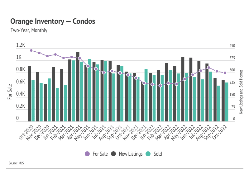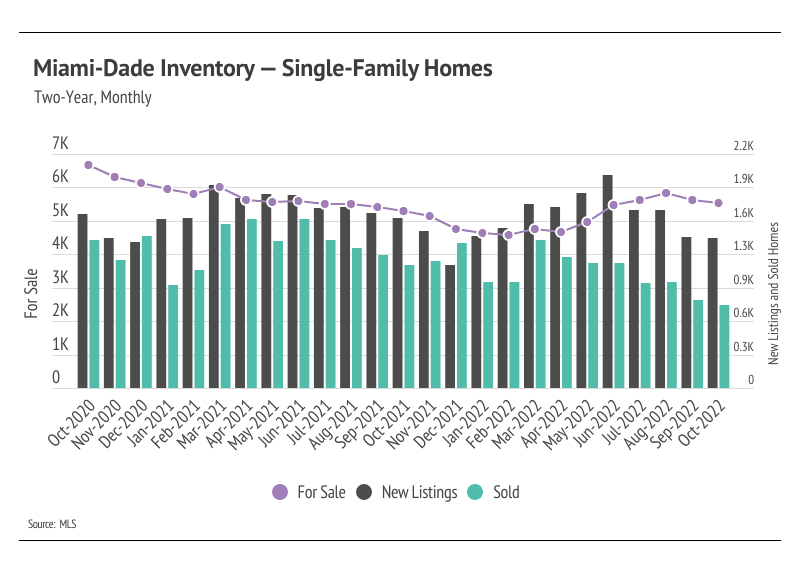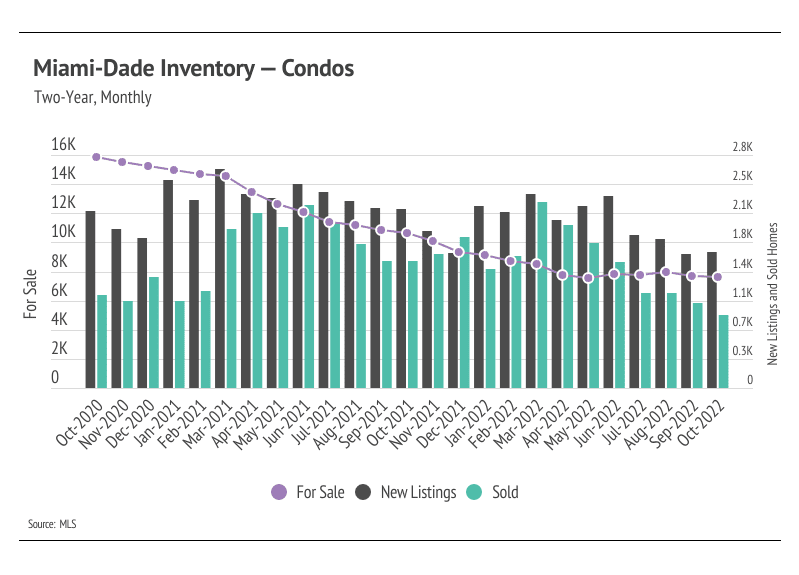 Single-family home and condo sales and new listings declined month-over-month, a trend that will likely continue through the rest of the year. Florida, along with the rest of the country, has not returned to pre-pandemic inventory levels after the buying boom last year. Now that we’re through most of 2022, we can see just how significant sales were in 2021 by comparison, especially in the spring and summer months. From March through July of last year, 10,340 single-family homes and condos sold across the selected markets. During the same period this year, 8,004 homes sold, a 23% decline. Fewer new homes have come to market in 2022, and the rising rate environment has dropped demand as well. We can tie new listings not only to supply, but also to demand, because sellers are often buying, too.