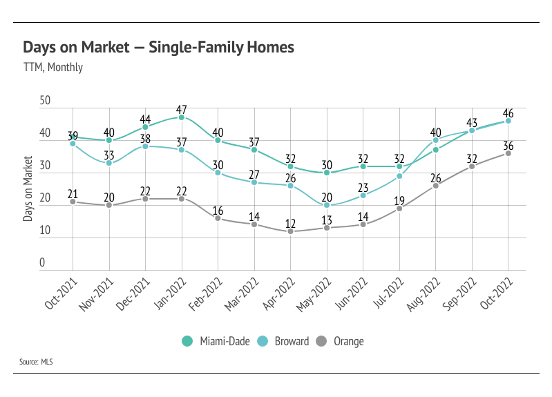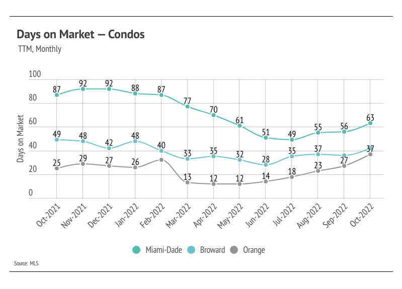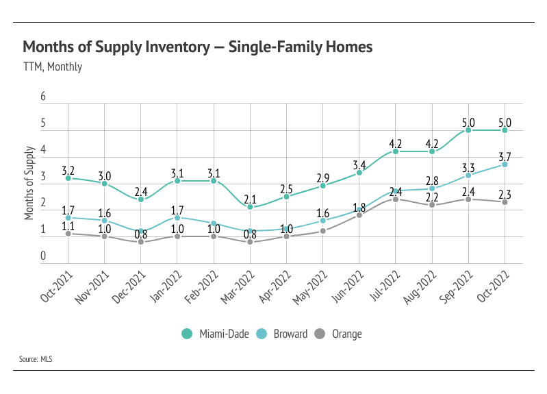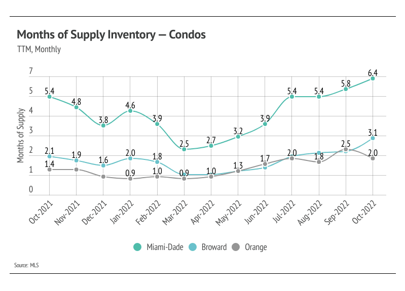 Months of Supply Inventory indicates the market is shifting from a sellers’ market toward a balanced market in Broward County and a buyers’ market in Miami-Dade County, while Orange County MSI continues to imply a sellers’ market.