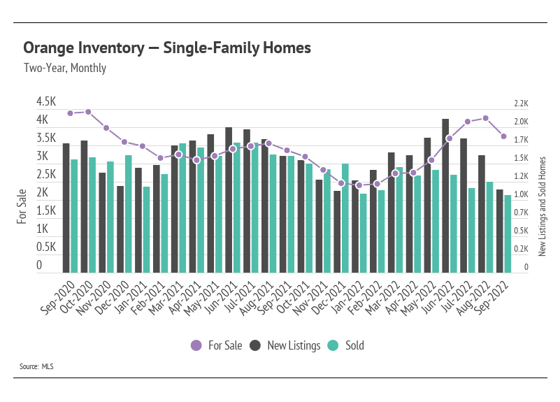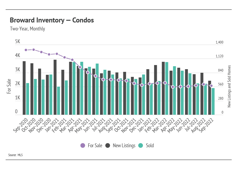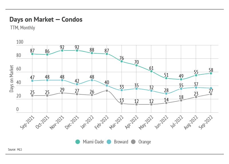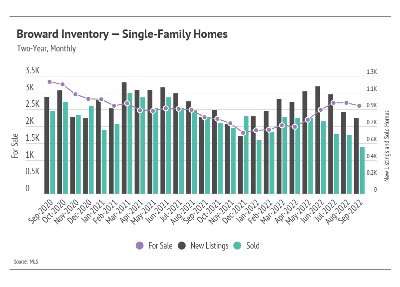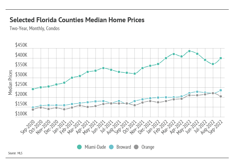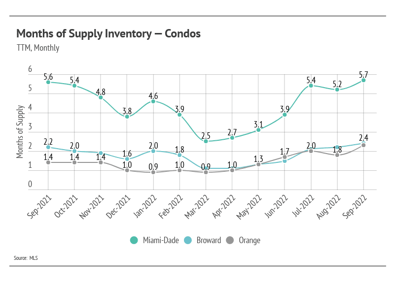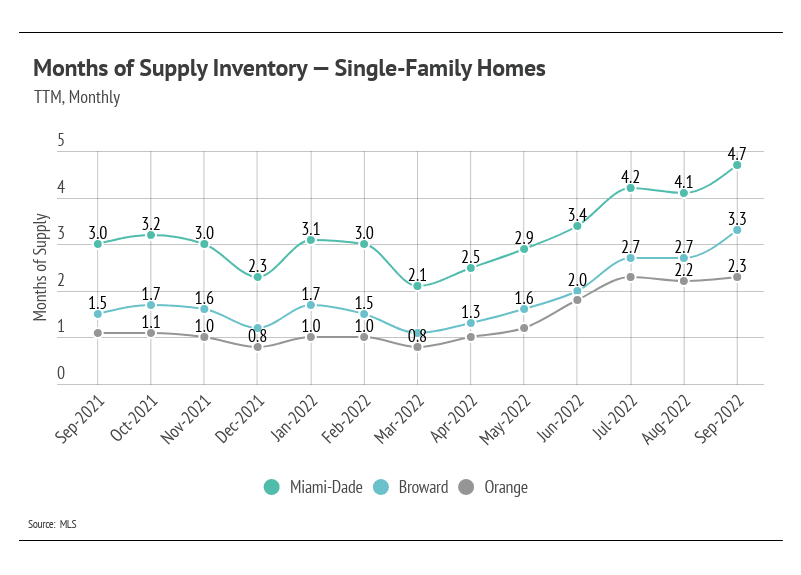 Single-family home and condo sales declined month-over-month across the selected Florida markets, along with new listings, which caused inventory to decline. Notably, Miami-Dade condo inventory fell to an all-time low in September. Florida metro areas, along with the rest of the country, have not returned to pre-pandemic inventory levels. Homes have generally sold faster over the past two years, making new listings more and more important to the market. Inventory generally grows when new listings increase or homes sit on the market. With rates rising at such a rapid pace, new listings are slowing considerably. We can tie new listings not only to supply, but to demand as well, because sellers are often buying, too. Softening demand has brought the market closer to balance despite historically low inventory.