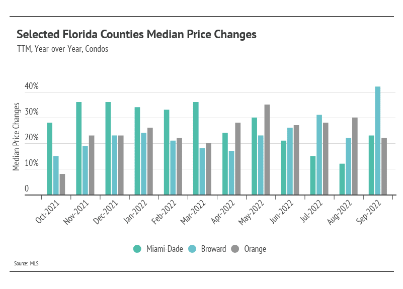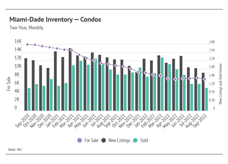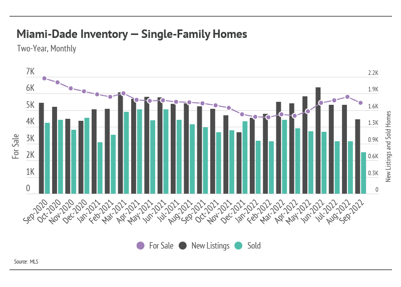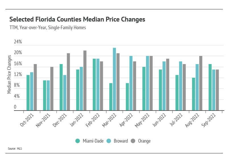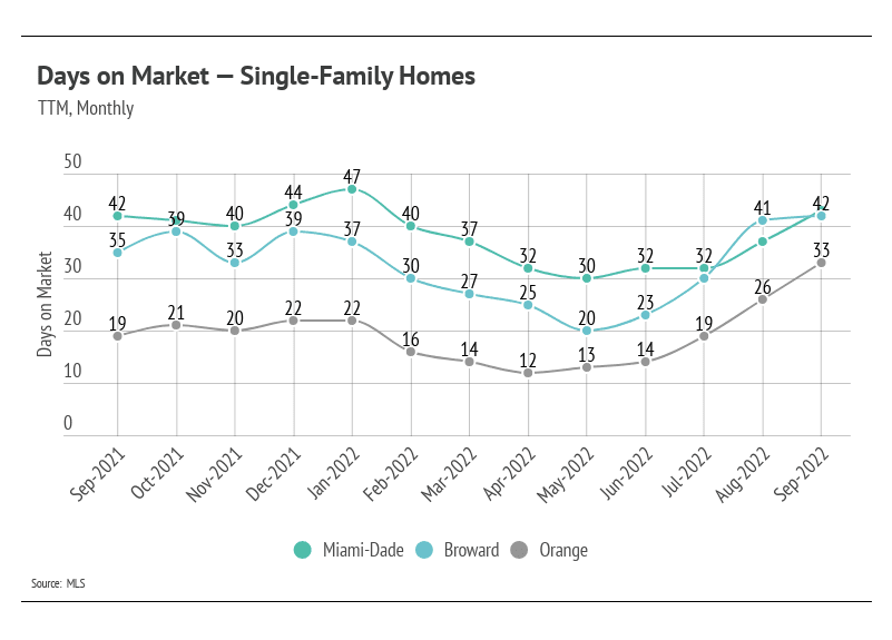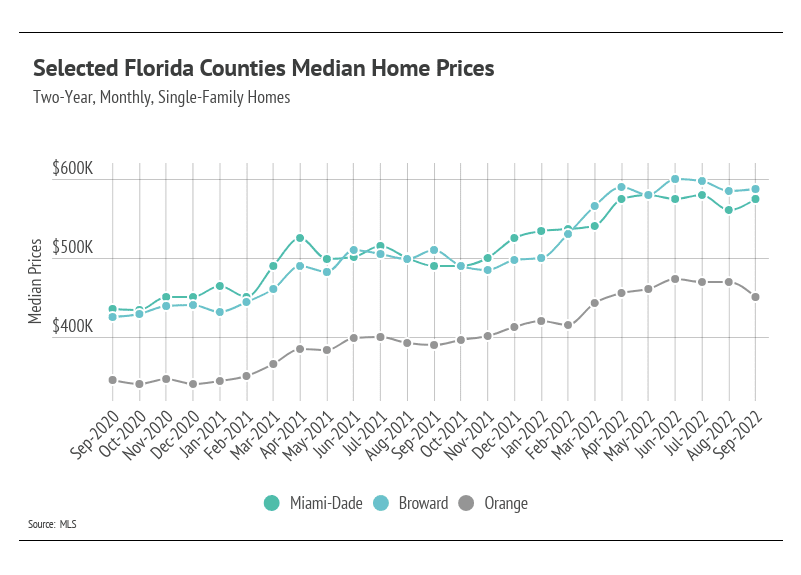 Single-family home and condo sales declined month-over-month across the selected Florida markets, along with new listings, which caused inventory to decline. Notably, Miami-Dade condo inventory fell to an all-time low in September. Florida metro areas, along with the rest of the country, have not returned to pre-pandemic inventory levels. Homes have generally sold faster over the past two years, making new listings more and more important to the market. Inventory generally grows when new listings increase or homes sit on the market. With rates rising at such a rapid pace, new listings are slowing considerably. We can tie new listings not only to supply, but to demand as well, because sellers are often buying, too. Softening demand has brought the market closer to balance despite historically low inventory.