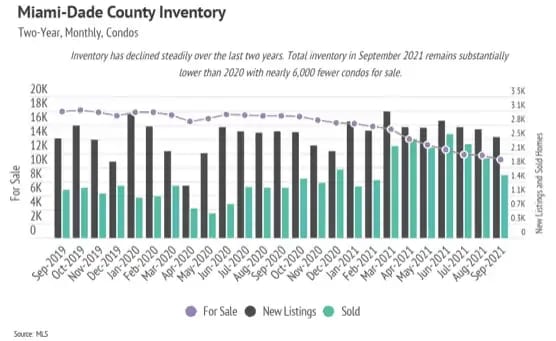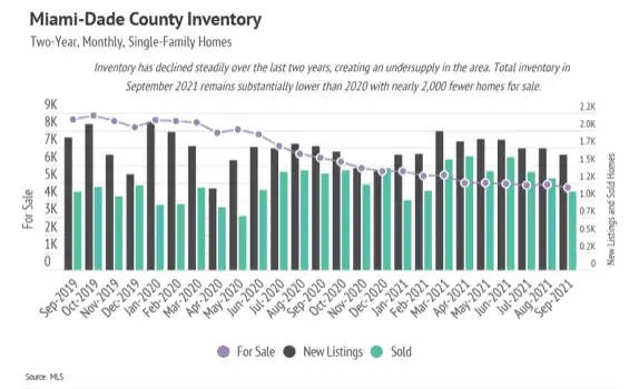 Inventory has declined steadily over the last two years. In 2021, more new listings have come to market, but these are quickly offset by the high number of sales. To fully understand the current inventory, we must look at it in the context of last year. In 2020, fewer people wanted to leave Florida and more people wanted to move to the area, increasing the population and driving inventory down to record low levels. New listings, therefore, improve the current market conditions. However, new inventory has not been able to meet demand, causing inventory to decline further. In September 2021, the selected counties had far fewer homes for sale than the year before. The sustained low inventory will likely cause prices to appreciate throughout 2021.